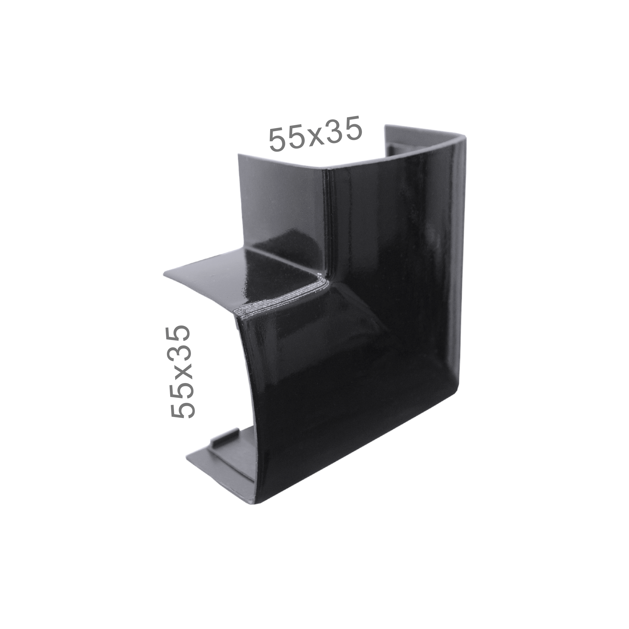 Curva Horizontal 90º Reta na dimensão 55x35mm ou 5,5cm x 3,5cm, na cor preta. Utilizada como acabamento na junção entre duas canaletas 55x35mm fixadas na mesma parede formando um ângulo de 90º. Fabricada em material plástico isolante, em peça única, com garras de fixação reforçada. Utiliza a própria base da canaleta para fixação.
