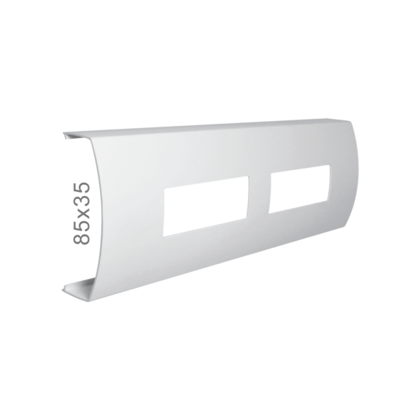 Curva Externa 90º raiada na dimensão 85x35mm (8,5cm x 3,5cm), possui um raio de afastamento onde facilita a conversão dos cabos em cruzamento externo de duas canaletas 85x35mm. Fabricada em material plástico isolante, em peça única, com garras de fixação reforçada onde são montadas na própria base.